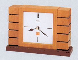 Solid wood case, Light cherry stain, Walnut stain base and accent lines, Protective glass lens. Based on the "board and batten" walls utilized in the Usonian homes, 1936-1959.