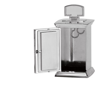 Metal case, Bright silverplate finish, Hinged front door opens to reveal jewelry compartment with hook, Metal dial with raised markers, Protective glass lens, 2" x 1" engraving plate included.