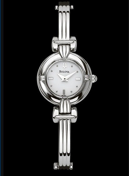 Bangle design with stainless steel bracelet, adjustable links, white enamel dial, metalized crysta and water resistance to 30 meters.