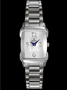 In stainless steel with curved metalized mineral crystal, white mother-of-pearl and embossed sunray pattern dial, blue metallic hands, black cabochon crown, deployment buckle and water resistance to 30 meters.