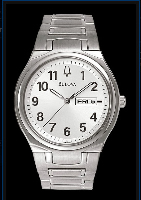 Silver-White dial. Stainless steel case and bracelet. Screw back. Fold-over buckle. Water resistant to 30 meters.