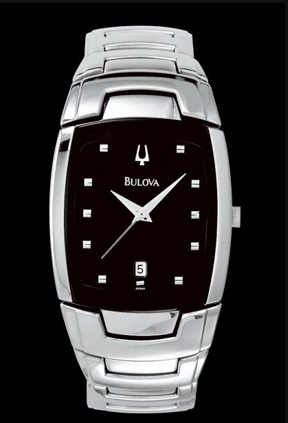 Black dial. Curved crystal and metalized rim. Stainless steel case and bracelet. Deployment buckle Water resistant to 30 meters/100 feet.