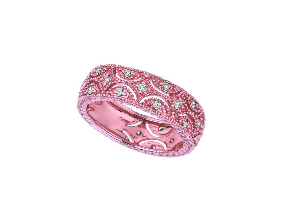 Diamond Eternity Band in 14K pink gold. The design, and the diamonds run all the way around this diamond ring. Please note that there is a small shank in the back for sizing. 25 diamonds arranged in a sparkling prong setting. DiamondEternity
