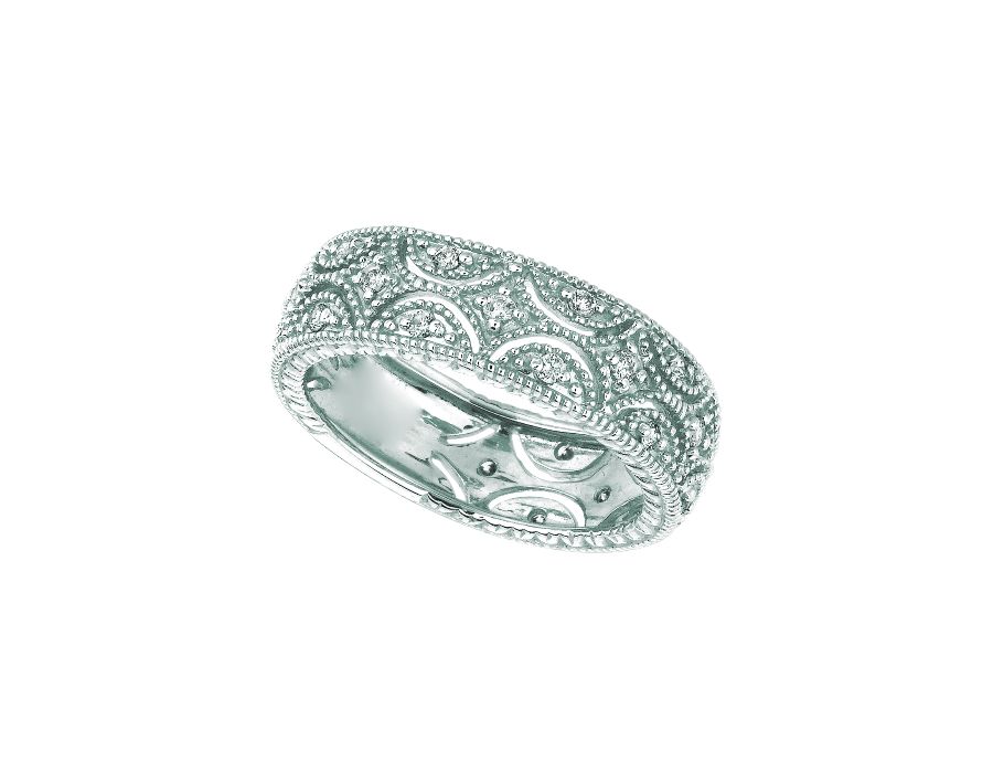 Diamond Eternity Band in 14K white gold. The design, and the diamonds run all the way around this diamond ring. Please note that there is a small shank in the back for sizing. 25 diamonds arranged in a sparkling prong setting. DiamondEternity