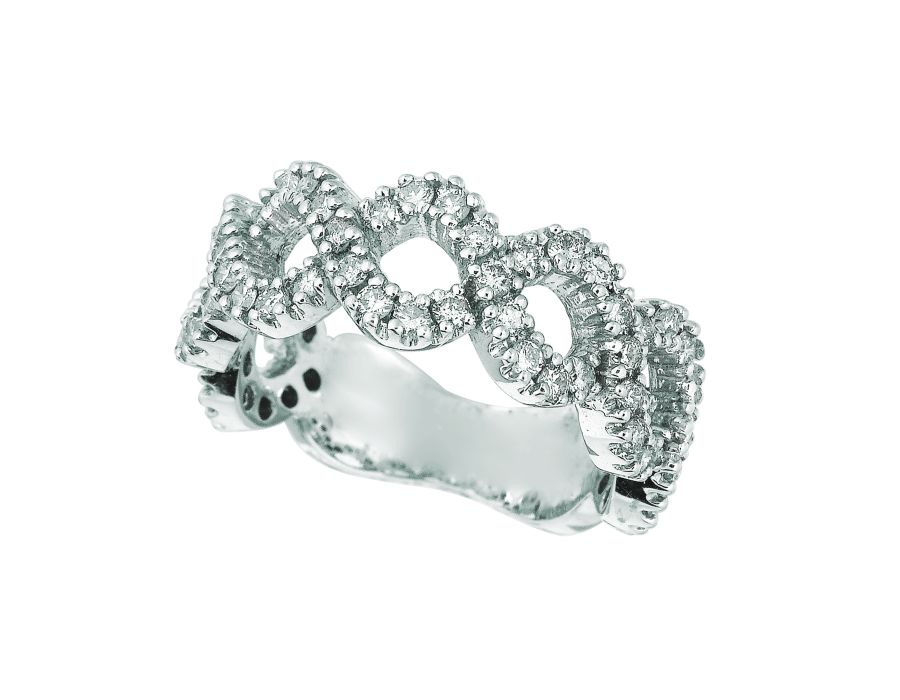 Diamond Swirl Ring in 14K white gold. 64 brilliant, sparkling, white diamonds dance in a curvy swirl around this ring.