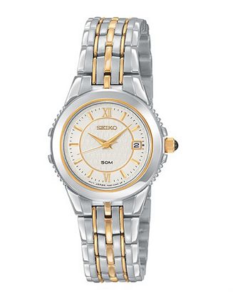 A beautiful silvertone bracelet with refined goldtone accents gives this women's watch from Seiko sophisticated charm. Stainless steel bracelet and round case. White round dial with textured center, goldtone markers, logo and date display. Quartz movement. Water resistant to 50 meters. Three-year limited warranty.