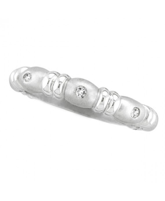 Diamond Bubble Ring in 14K white gold. The bubble design runs all the way around this ring, except for a small shank in the back for sizing. 3 pave set diamonds in this diamond fashion ring. Sparkling diamonds that measure 1.5mm in size.