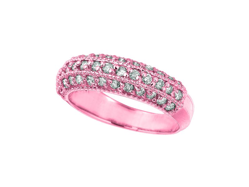 Diamond Fashion Ring in 14K pink gold. 3 rows of diamonds run across the front of this ring. 40 diamonds in total, which are set in a sparkling prong setting.