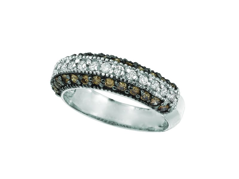 Champagne & White Diamond Fashion Ring in 14K white gold. One row of 14 diamonds run across the front of this ring, and are joined by 26 champagne diamond ? one row on top, and another on the bottom. Stones are set in a sparkling prong setting. Black rhodium around the champagne diamond for a designer?s touch.