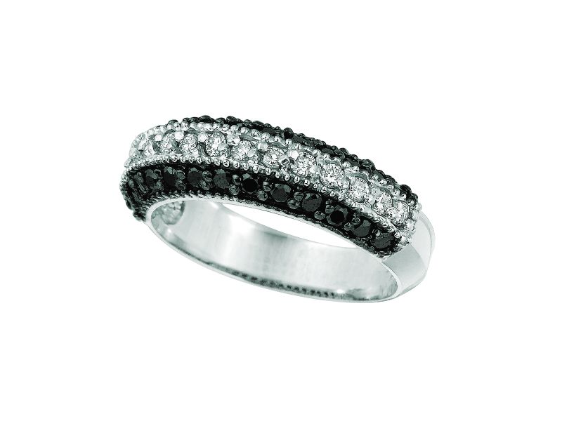 Black & White Diamond Fashion Ring in 14K white gold. One row of 14 diamonds run across the front of this ring, and are joined by 26 black diamond ? one row on top, and another on the bottom. Stones are set in a sparkling prong setting. Black rhodium around the black diamond for a designer?s touch.