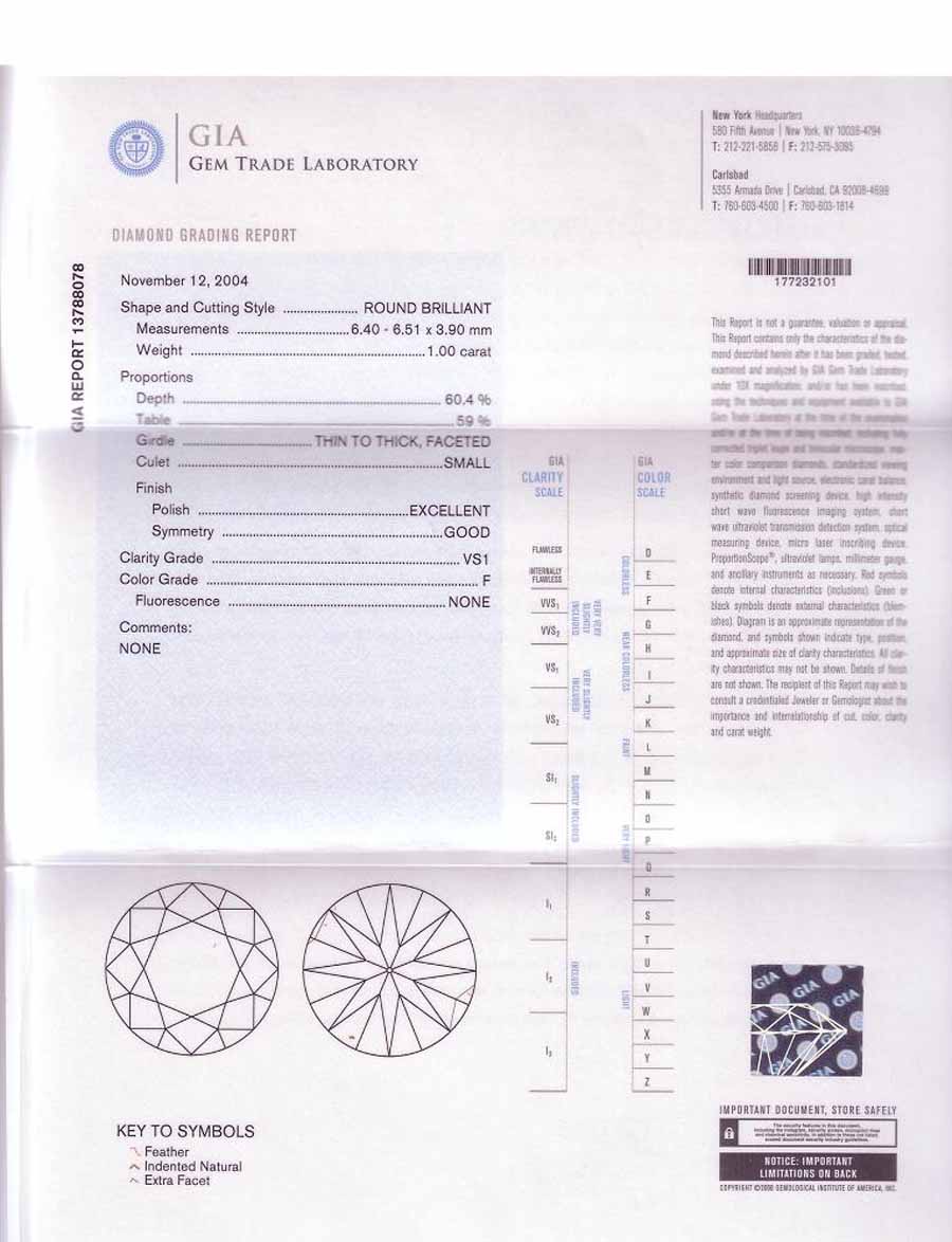 Round Brilliant Cut Diamond GIA Cert 1.00ct Color F; Clarity VS1