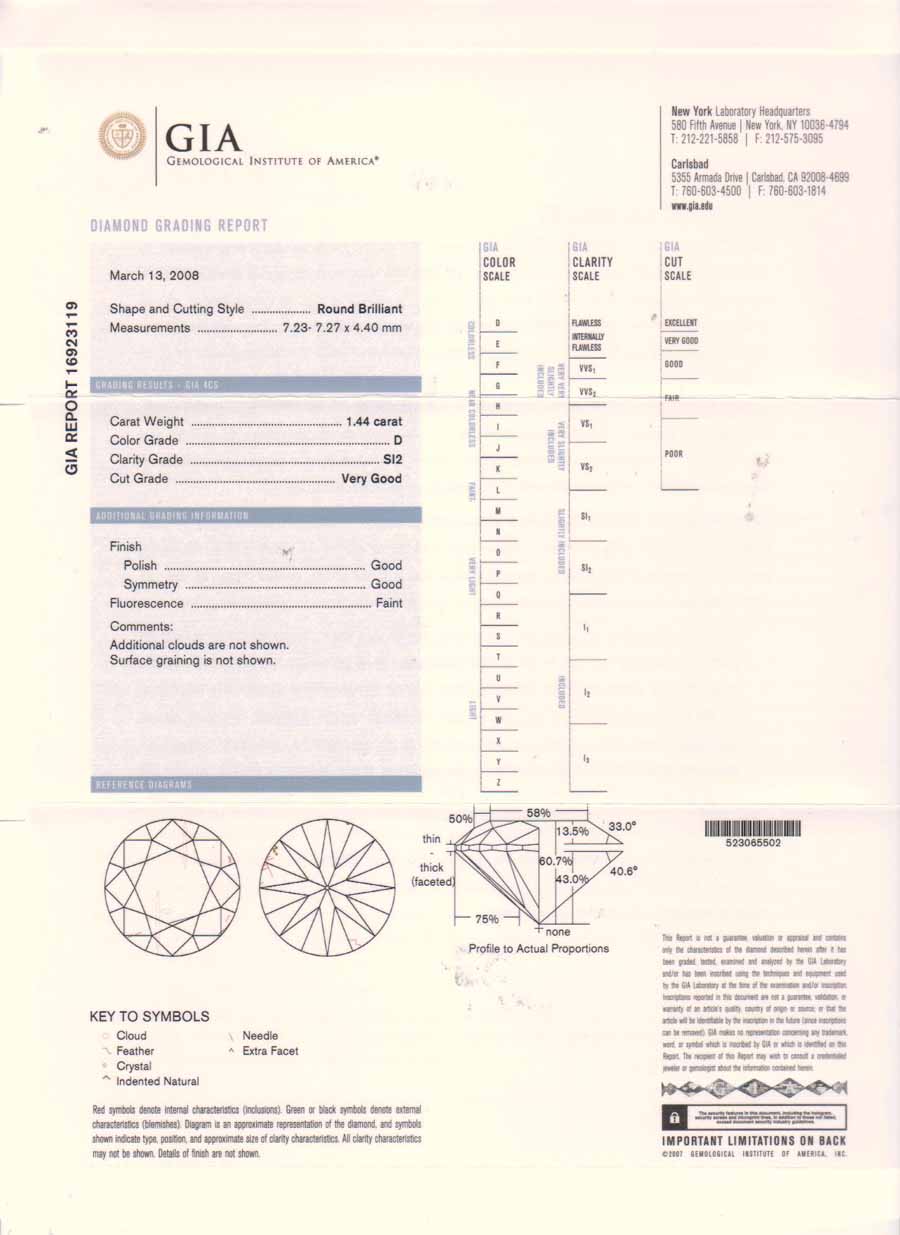1.44ct Round Diamond GIA Cert ; Color D; Clarity SI2