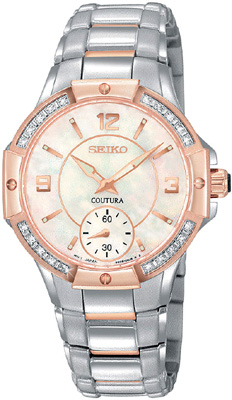 Stainless Steel case and bracelet. White Mother of Pearl dial. Fixed bezel. Scratch Resistant Sapphire crystal. Push Button Deployment clasp. Quartz movement. Water resistant to 100m / 330ft. 32mm case diameter. Bezel set with 20 diamonds. Snap case back. Lumibrite hands and markers. Seiko Coutura Diamond Sub-Dial Ladies Watch SRKZ88.