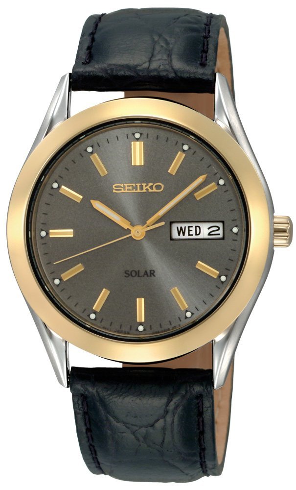 Seiko SNE050 Solar Mens Watch - Gray Dial - Two-Tone - Black Leather Strap - Day-Date