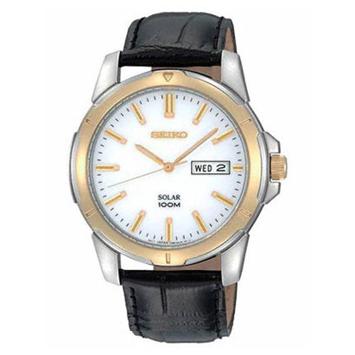 Seiko SNE104 Mens Watch Two Tone Solar Quartz White Dial Black Leather Strap